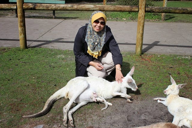 Tempat pertama kami spend ialah di kawasan kanggaroo.Kanggaroo kebanyakannya macam dah kenyang jadi ia tak heran sangatlah dengan makanan yang dihulurkan.Makanan kanggaroo ada disediakan di situ jadi boleh ambil saja untuk feed kanggaroo sambil bergambar-gambar.